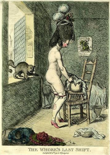 The Whore's Last Shift, James Gillray, 1779. From this view of her room and hole in her stocking, we can surmise that her life was far from glamorous. One can imagine that her tower of elaborately styled hair, kept in shape with grease, lard, and powder for days at a time, contained any number of itching lice and vermin when the arrangement was dismantled.