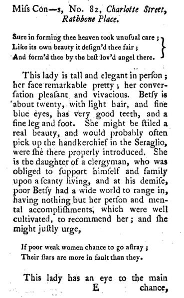 Demand for these lists was so great that 8,000 copies of the first edition were printed. London’s prostitutes were identified by name, location, and their special charms. Here’s a description of Miss Devonshire of Queen Ann Street, who had ‘a fair complexion, cerulean eyes and fine teeth.: