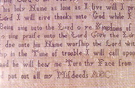 The Bodleian Library in Oxford recently exhibited a sampler (along with other items) for one day to celebrate World Book Day on March 1. This linen cross stitch sampler, purportedly made by a 12-year-old Jane Austen in 1787, was displayed for the very first time. The stitching has become frayed and undone, so that the sampler appears to have been made in 1797. A stylized border with flowering trees surround the words to the psalm, “Praise the Lord O my soul.”