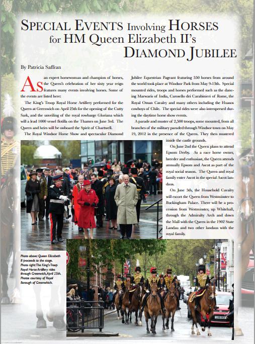 Gentle readers, Patricia Saffran has contributed many articles for this blog regarding the royal family, horses, and museum exhibits. This article was printed in the June issue of Horse Directory Magazine. Patricia writes about the celebratory events that are planned in the next few days. I have placed an image of the page of the magazine below. Her text and images of the magazine’s page sit further below this post: