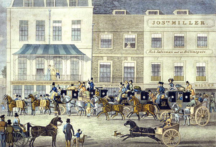 [William] Hazlitt has thus described, in his own graphic manner, the scene presented on the starting of the old mail-coaches:—”The finest sight in the metropolis,” he writes, “is the setting off of the mailcoaches from Piccadilly. The horses paw the ground and are impatient to be gone, as if conscious of the precious burden they convey. There is a peculiar secrecy and dispatch, significant and full of meaning, in all the proceedings concerning them. Even the outside passengers have an erect and supercilious air, as if proof against the accidents of the journey; in fact, it seems indifferent whether they are to encounter the summer’s heat or the winter’s cold, since they are borne through the air on a winged chariot. The mail-carts drive up and the transfer of packages is made, and at a given signal off they start, bearing the irrevocable scrolls that give wings to thought, and that bind or sever hearts for ever. How we hate the Putney and Brentford stages that draw up when they are gone! Some persons think the sublimest object in nature is a ship launched on the bosom of the ocean; but give me for my private satisfaction the mail-coaches that pour down Piccadilly of an evening, tear up the pavement, and devour the way before them to the Land’s End.” – British History Online