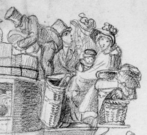 For a family living on £25 – £30 per year, such costs were prohibitive. The cheapest seats were on top and on the outside. One can see a woman holding her child wedged between straw baskets. Should the coach take a turn too fast or be involved in an accident, she and her babe could be flung off the vehicle or trapped underneath should it overturn. At best, they felt the wind and rain and arrived at their destination disheveled and covered in road dust if the weather was dry, or soaking wet with rain. One shudders at the thought of what it felt like to be an outdoor passenger in the winter.