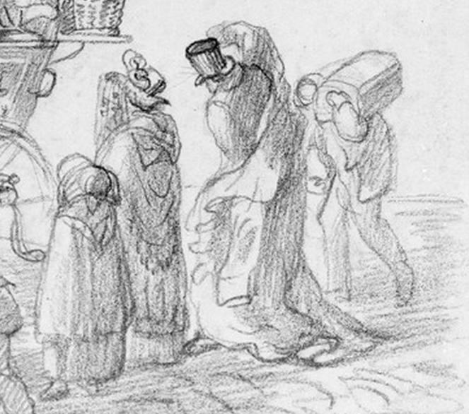 One wonders how many more pieces of luggage the mail coach could possibly take on. The packages must be heavy for the porter walking towards the coach is bent over. The male passenger’s great coat and hat are typical of men’s outer wear at the time. As I study the detail below, I am becoming more convinced that the woman and girl are waiting to board. She is wearing a veil, to protect her face from dust, no doubt, and both are covered in layers of outer wear, including a shawl over a cloak. Even so, the ride for exposed passengers would be cold. From the clothes, one can only assume that it is winter.