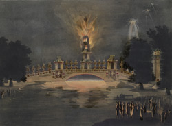 Fireworks were quite dangerous, and so were gas lit fires. In 1814, another grand celebration was planned in St. James Park (which lies close to Green Park) to commemorate 100 years of the Hanoverian royal family. A seven-story pagoda was erected on a Chinese-style bridge spanning the canal in St. James’s Park.