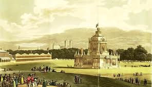 The splendid gala was organized for the joint August first celebration of the Hanoverian Centenary and the anniversary of the Battle of the Nile. The brilliant and daring tactics of Lord Nelson at the Battle of the Nile were represented by rowboats upon the canal. A disaster occurred when the gas lit pagoda caught fire and burned. Two men were killed and a number injured trying to put out the fire. A number of the Royal swans succumbed to smoke and fire. The crowd unaware that this was an accident took the occurrence to be part of the spectacle and applauded wildly. – The Georgian Index