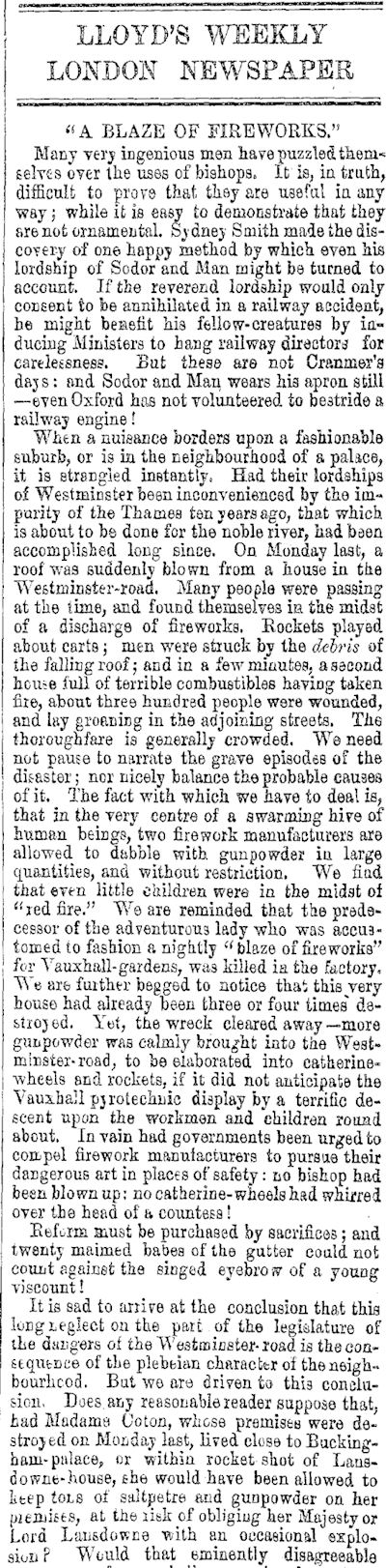 There were terrible accidents then as now with fireworks. Here is an account from an 1858 newspaper** about an accident in central London: