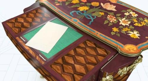 This beautiful marquetry table transforms into a desk with a turn of a key. This short animated film shows you how it operates and how an elegant French lady in the 18th century would have used it. Enjoy.