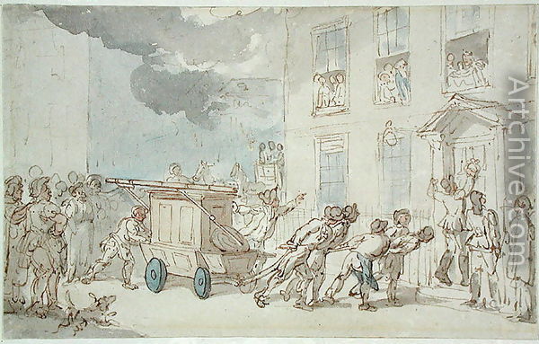 Once a fire had gained as much ground as depicted in this illustration, there was little chance of saving the building. Rowlandson shows some people carrying out their belongings, while others were barely able to get dressed. By now an alarm had probably been sounded in the community. Bucket brigades, in which people were arrayed in long lines to the nearest well and passed buckets in a continuous motion, could probably put out a minor fire, but not one of this magnitude. In the 1800s, almost 150 years after the great fire, there was still no centralized fire brigade.