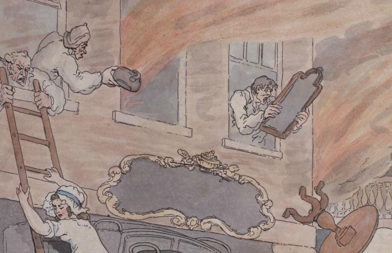 Panic and pandemonium ensue. A man contemplates tossing a mirror from the second story, another pours his ineffectual chamber pot over the flames. A side table has been tossed through the window, while an anxious woman descends a ladder.