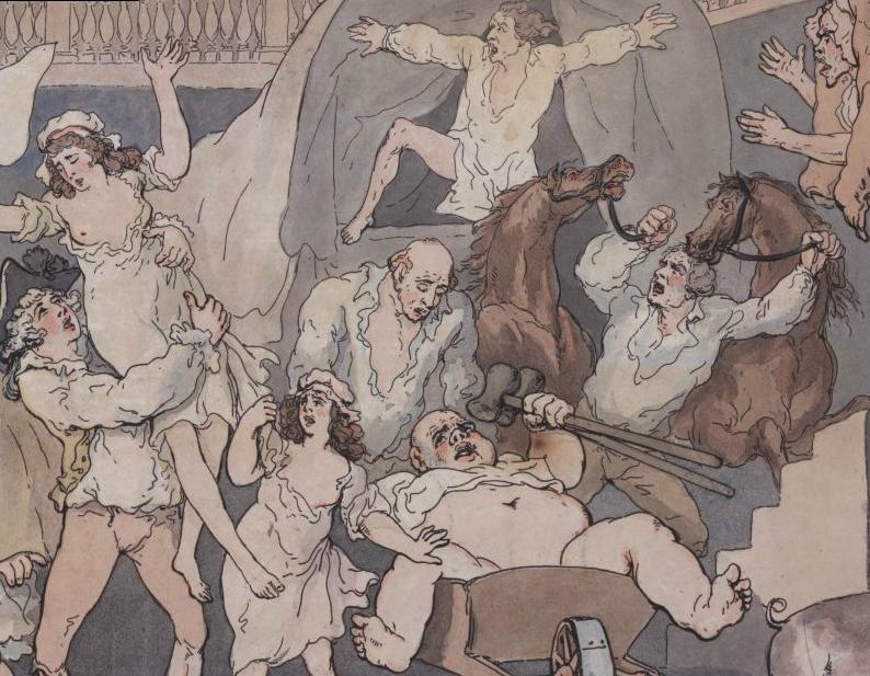 People are in various states of dress and undress. Some help others, some are overcome with panic. A disabled man is carried from danger in a wheel barrow, while a groom tries to calm two terrified horses.
