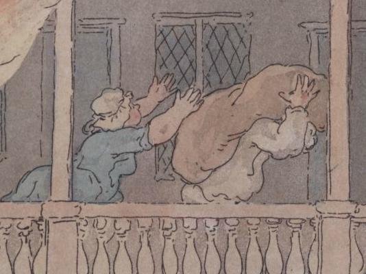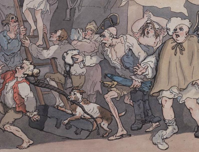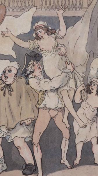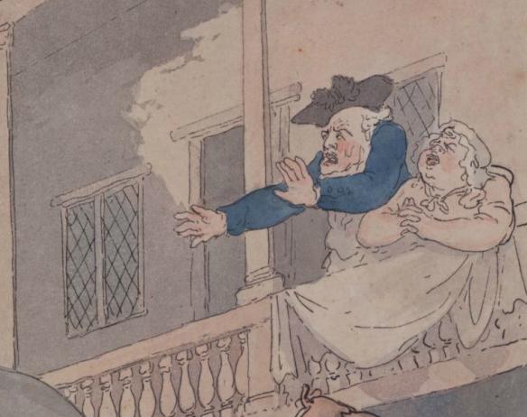 Elements in Rowlandson’s cartoon show a direct association with classical language and Tobias Smollet. The young man saving the girl in distress is reminiscent of Giambologna’s statue of the Rape of the Sabine Women, as well as Peregrine Pickle’s heroic actions towards Emilia.