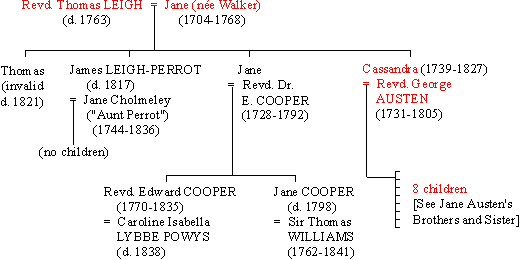 Elizabeth gave birth to twenty-two children. We are familiar with the mortal threat to women’s lives from childrearing – three of Jane Austens’ sisters-in-law suffered that fate. Elizabeth survived her twenty-two deliveries and lived to the age of 77. Not all of her children fared so well – only fifteen were baptized, and of those, three sons and five daughters survived infancy. This was far from unusual – Antonia Fraser, in her study of 17th-century woman, The Weaker Sex, stated that it was normal for only a third of children born to a large family to survive. Their eldest child, Mary Bridges, was one of the survivors. The link to Jane Austen can now be traced within a few generations. Mary married Theophilus Leigh; they were Cassandra Leigh’s paternal grandparents and the parents of Theophilus Leigh, who served as Master of Balliol College in Oxford from 1726 until his death in 1785. Theophilus Jr.’s brother Thomas Leigh married Jane Walker, and they were Cassandra Leigh’s parents. Cassandra, who married George Austen, gave birth to eight children, including Jane Austen in 1775. (And she too survived to a ripe old age, outliving her daughter Jane by 10 years.)
