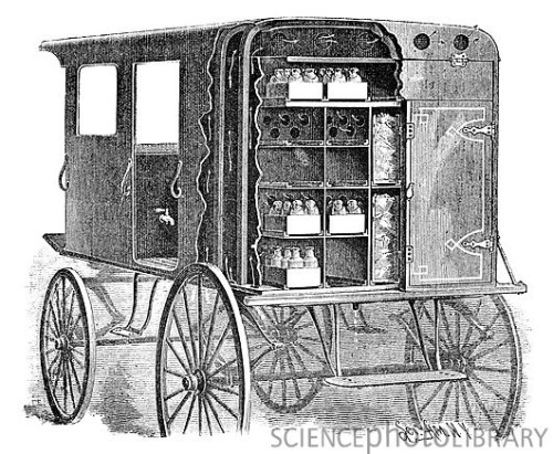 Refrigerated milk cart, 19th c. This design, from the USA, used ice to keep the air temperature cool for the transport of milk. Holes in the compartments allowed air to circulate from where the ice compartments to the milk compartments.