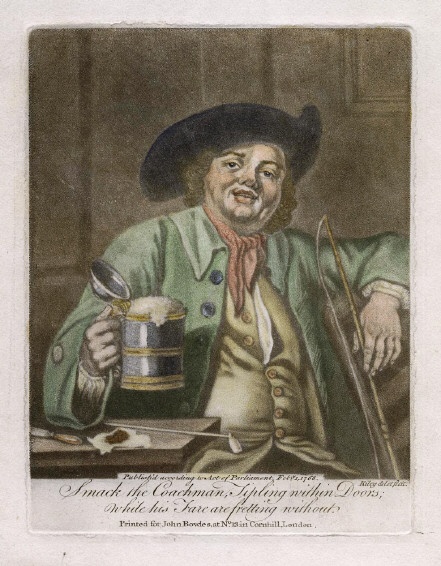Coachman, seated, holding a tankard. Mezzotint by Ryley, printed in colours for John Bowles in London Feb. 1st, 1768