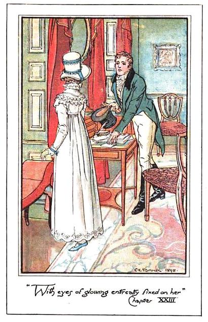 The season was full, the room crowded, and the two ladies squeezed in as well as they could. As for Mr Allen, he repaired directly to the card-room, and left them to enjoy a mob by themselves. With more care for the safety of her new gown than for the comfort of her protégé, Mrs Allen made her way through the throng of men by the door, as swiftly as the necessary caution would allow; Catherine, however, kept close at her side, and linked her arm too firmly within her friend’s to be torn asunder by any common effort of a struggling assembly.”