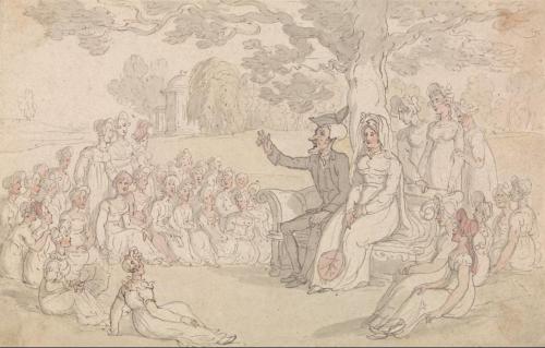 Dr syntax visits a boarding school for young ladies,1821. This image from the Yale Center of British Art is much paler than mine, in which the headmistress’s skirt is colored red and the young ladies in the foreground wear colored dresses.