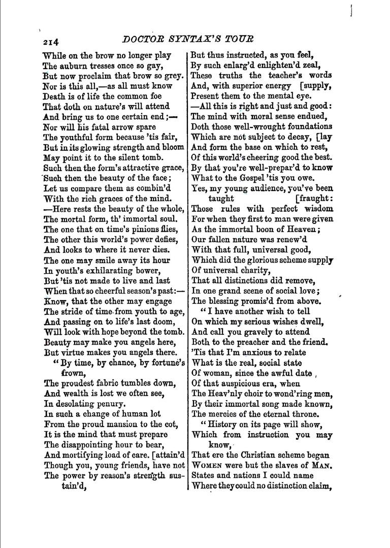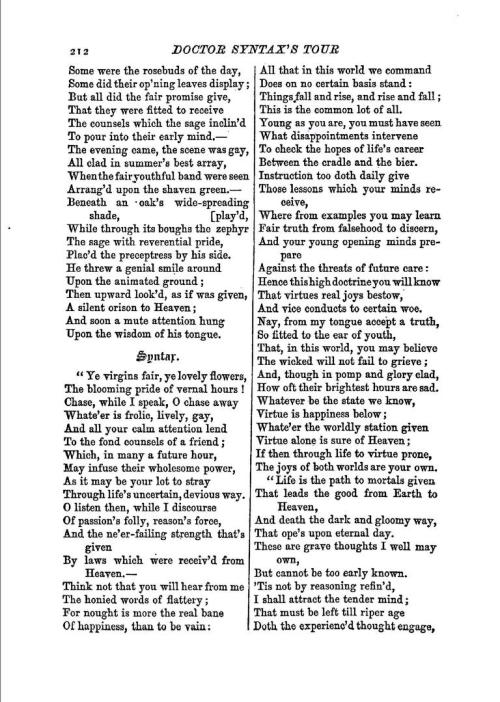 Below sits the text (in verse) that accompanied this image, in which Dr. Syntax expounds on his listeners’ youth and character, and how they can learn from good example: