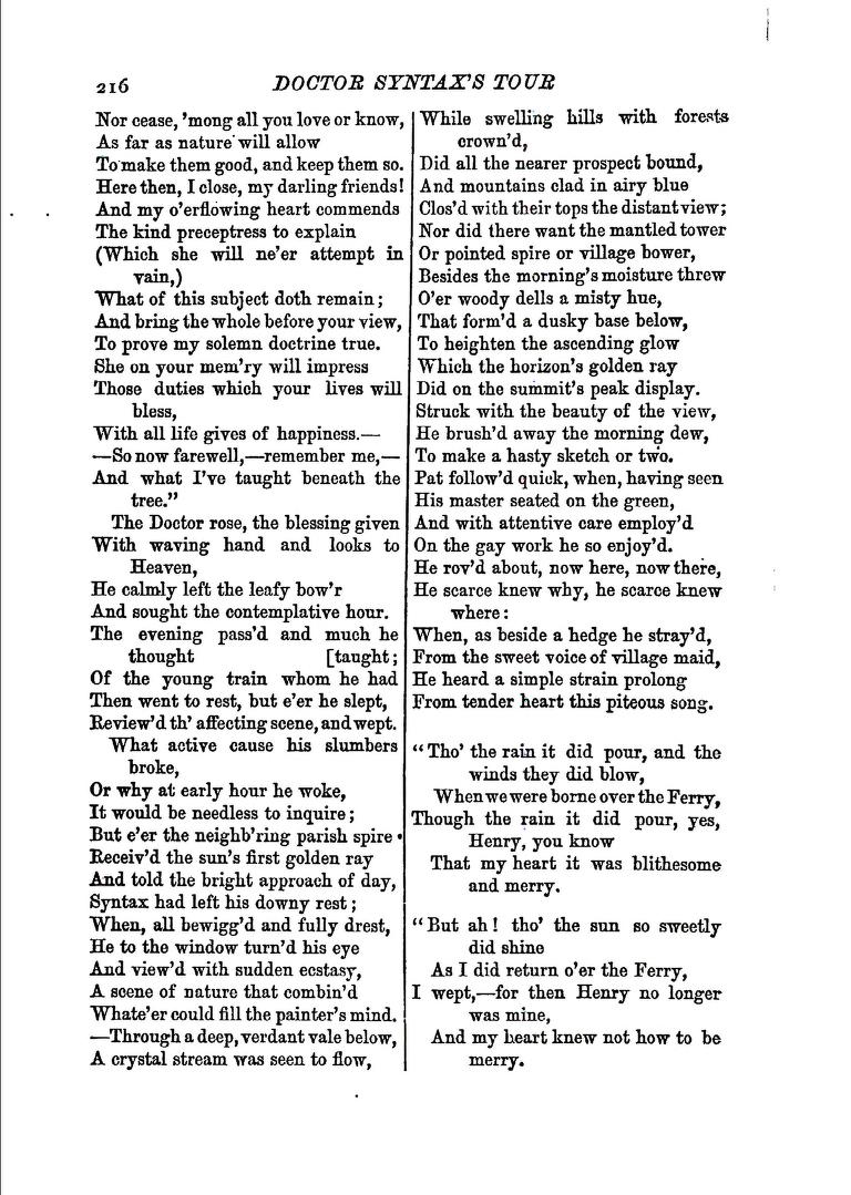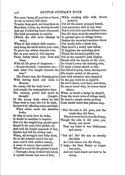 - Dr. Syntax’s Three Tours Doctor Syntax’s three tours in search of the picturesque, consolation, and a wife. By William Combe. The original ed., complete and unabridged, with the life and adventures of the author, now first written, by John Camden Hotten. Eighty full page illustrations drawn and coloured after the originals by T. Rowlandson. Published 1868 by J. C. Hotten in London . Library of Congress, PR3359.C5 D6 1868