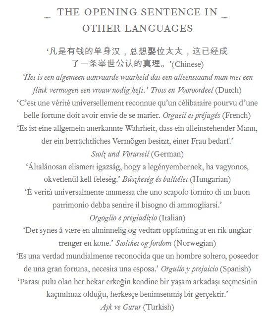 Opening sentence of Pride and Prejudice in different languages. Fullerton discusses its meaning in quite some detail.