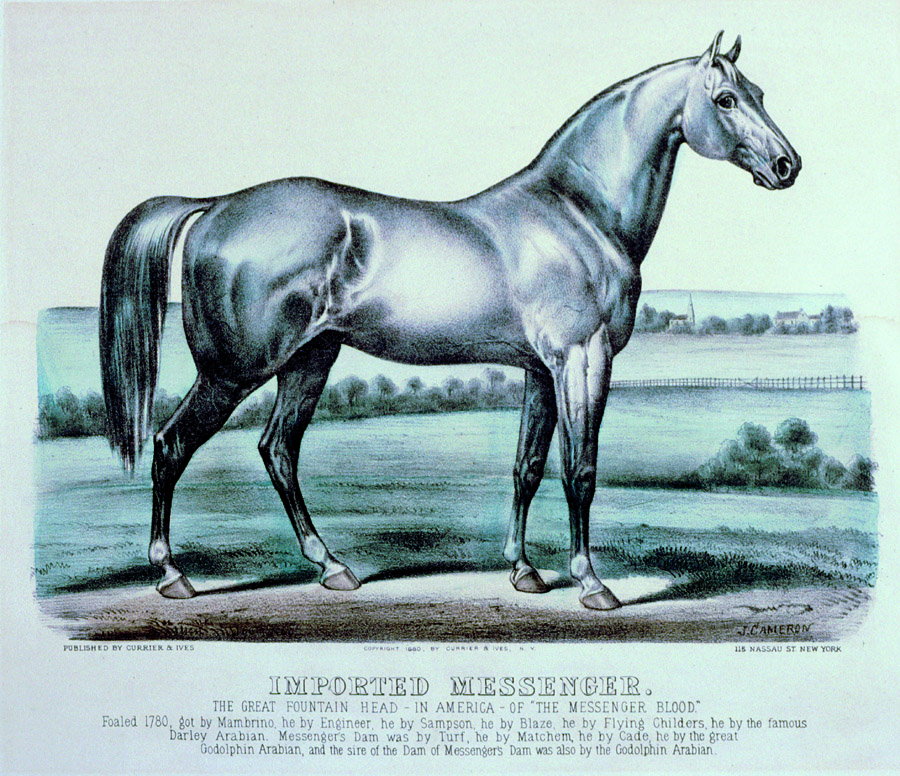 Messenger by Currier and Ives, courtesy of the Harness Racing Museum and Hall of Fame, Goshen, NY,-public domain image.