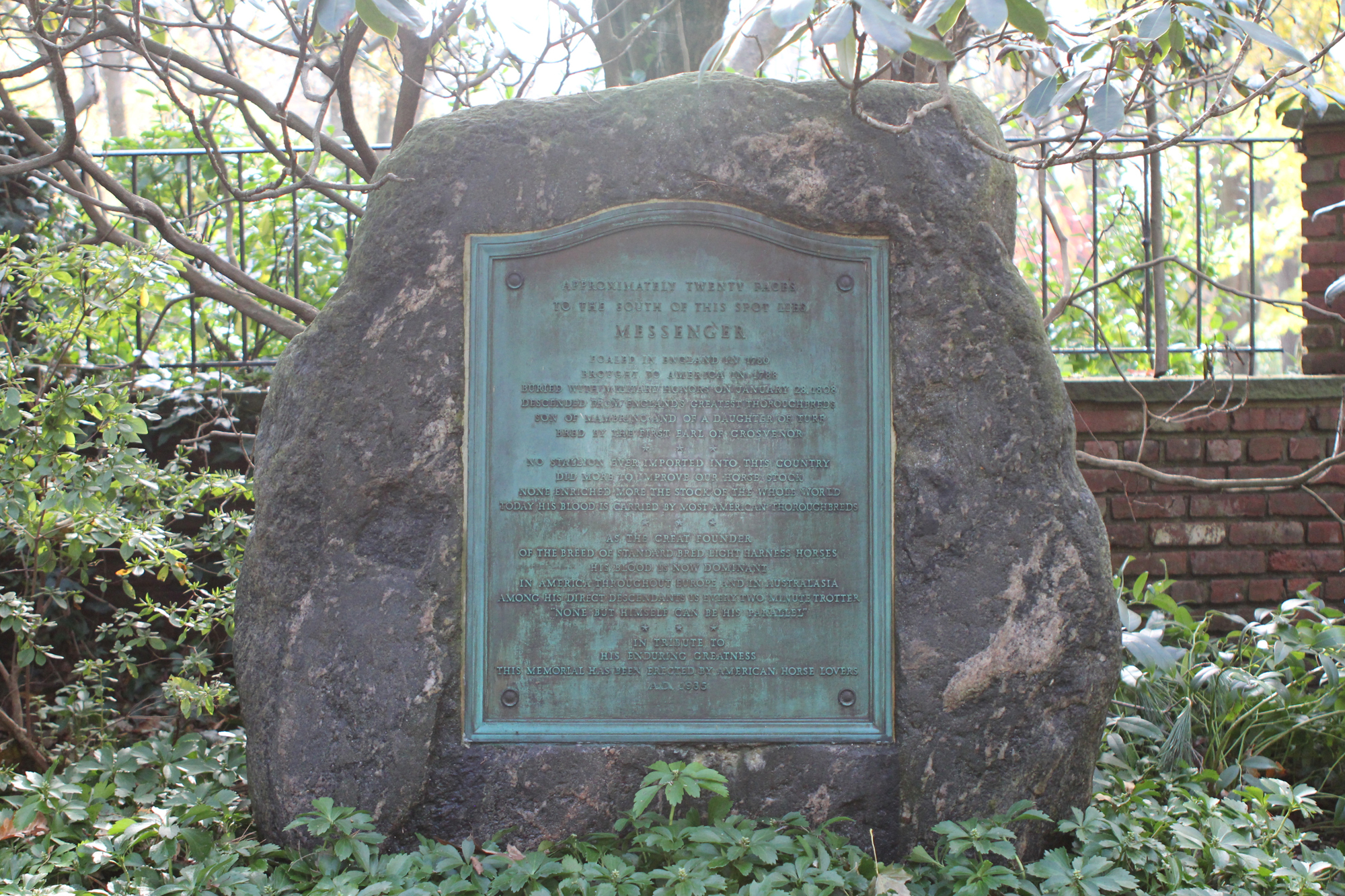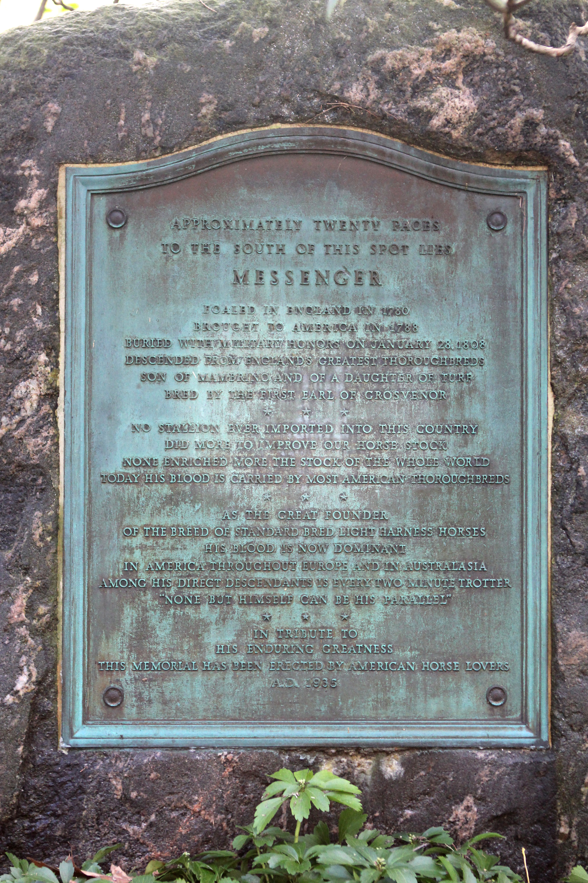 “Approximately twenty paces to the south of this spot lies MESSENGER, Foaled in England in 1780, brought to America in 1788, Buried with military honors on January 28, 1808, Descended from England’s greatest Thoroughbreds, Son of Mambrino and of a daughter of turf, Bred by the First Earl of Grosvenor, No stallion ever imported into this country, Did more to improve our horse stock, None enriched more the stock of the whole world, Today his blood is carried by most American Thoroughbreds, As the great founder, Of the breed of Standard Bred light harness horses, His blood is now dominant, In America throughout Europe and in Australia, Among his direct descendants is every two minute trotter, ‘None but himself can be his parallel’, [Homer describing Hercules] In tribute to, His enduring greatness, This memorial has been erected by American horse lovers. A.D. 1935”.