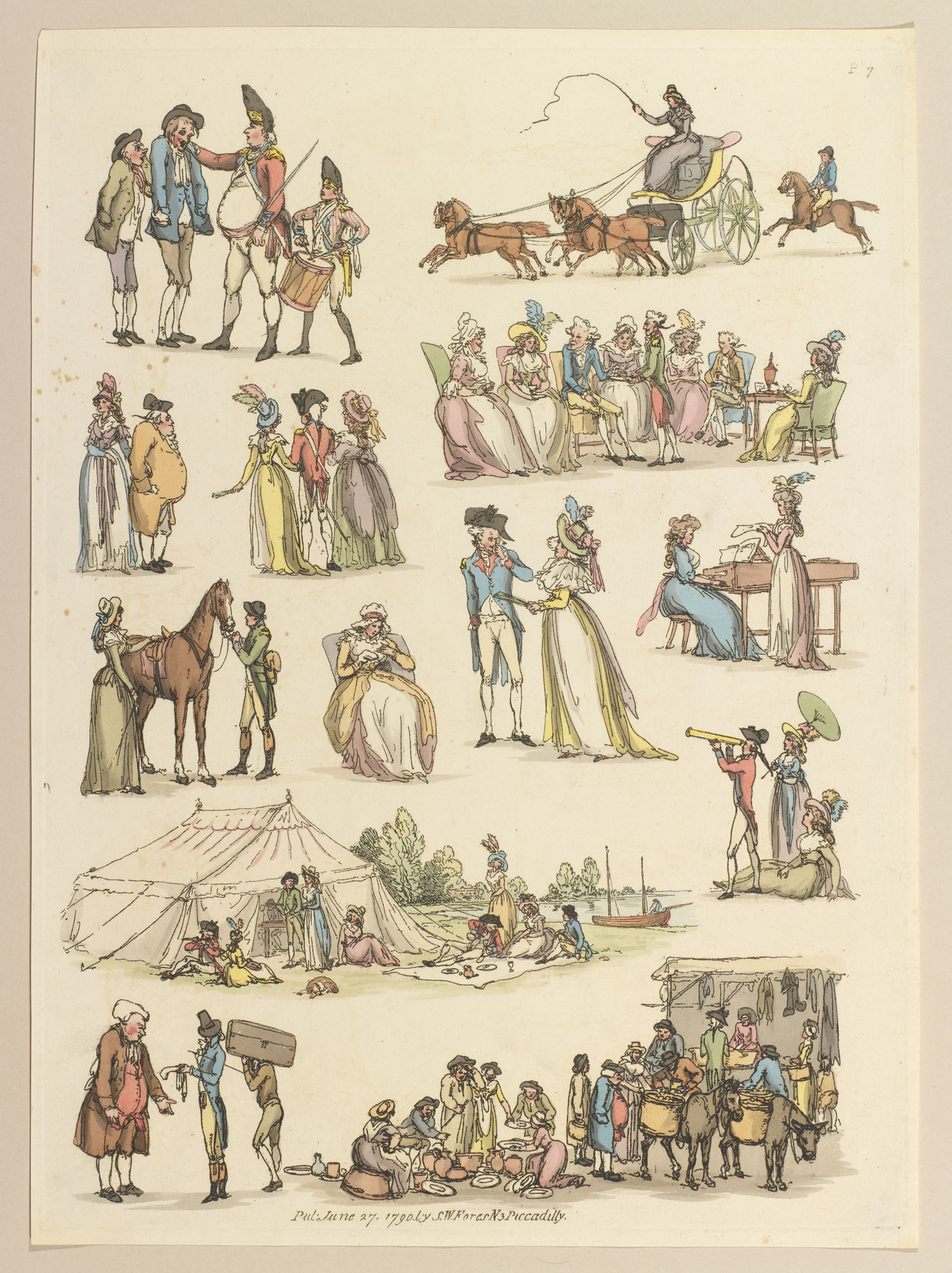 A hand-coloured print with 12 vignettes of everyday life and work. Included in the designs are: Assessing new recruits for the army; carriage driving; promenading; a tea party; horse-riding; a woman with needlework; flirtation; a woman playing the harpsichord whilst another woman sings; a picnic by a river; a man looking through a telescope; an exchange of money between one man and another man and street vendors. Plate 7.