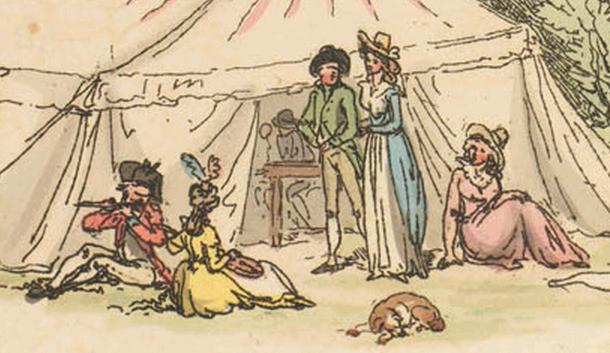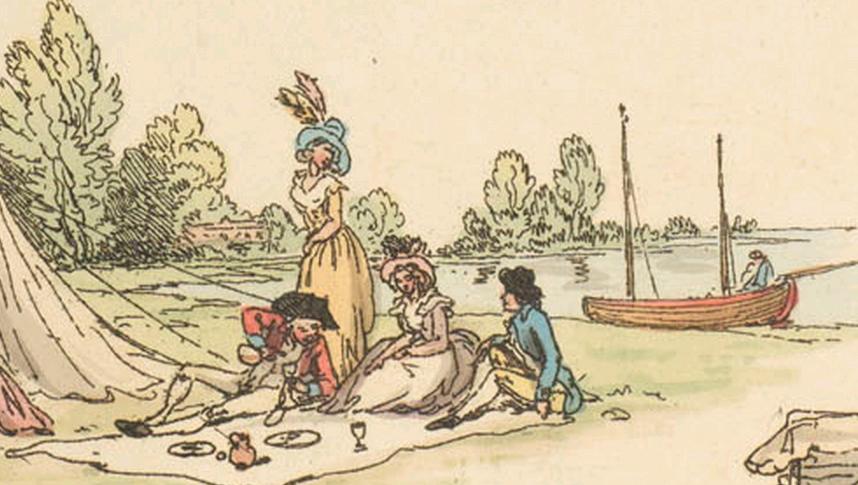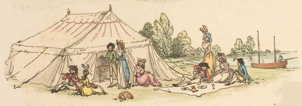 A dog sleeps peacefully among the assembly and a female guest rests while leaning against the tent. Inside, a man sits at a table. It must have taken some effort to transport all that food and equipment, and I wonder if this was done via the boat and river earlier in the day as the rest of the party walked from the country house (visible in the background) to the picnic site. One thing is for certain, Rowlandson’s contemporaries would have known first-hand how such a picnic was contrived.