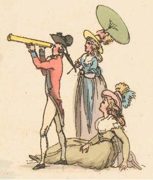 The image above causes me to believe that the woman being ogled may not be entirely suitable for polite company, or she may well be a widow who cares not a fig about her reputation. Her companion is openly eyeing her through his eye glass. To be sure, they might well be standing in the Pump Room in Bath, where they would be surrounded by a crowd of people. Can you imagine Lizzy Bennet holding still under such scrutiny? Methinks not.