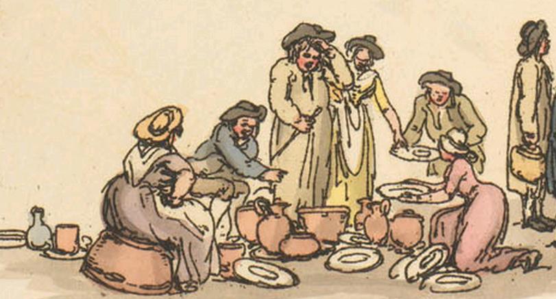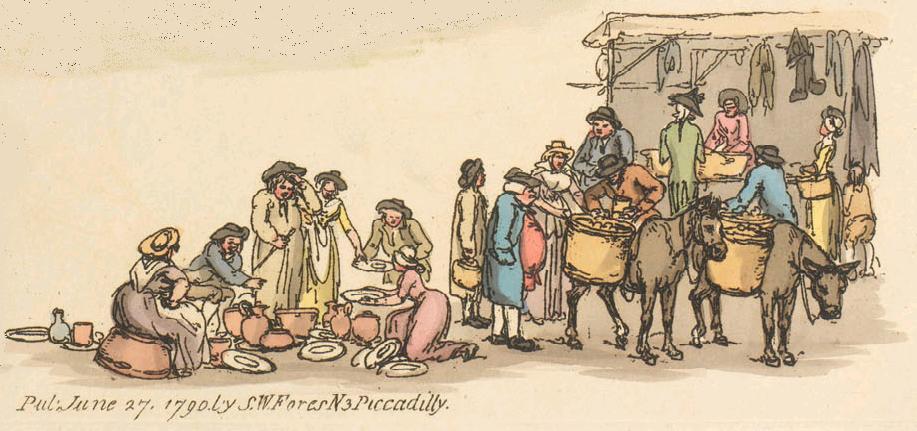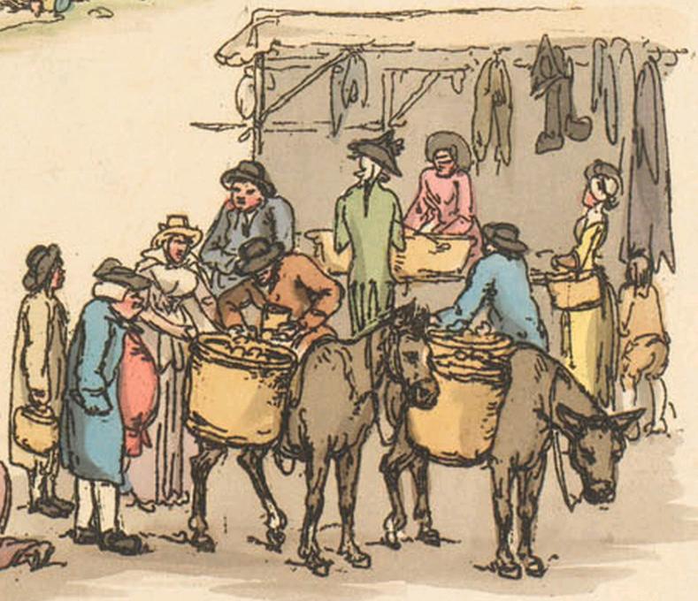 Items of clothing seem to be sold in the stall, while bulk food (potatoes, grain?) is carried by the donkeys. When the Austen family moved from Steventon to Bath, their diets changed drastically, for they had to depend on food purchased at local markets. They had grown their own vegetables in the country, and owned a cow and a few chickens and pigs. In Steventon, the Austen family could largely eat off the bounty of their land, stretching their budget, but in Bath they depended on food carted in from surrounding farms and milk from anemic city cows who lived in dank stalls and were put out to pasture in public parks. Purchased food was often doctored, and it was almost impossible to eat fresh seafood, unless one lived near the coast. For many reasons, including the matter of finding fresh and affordable food, Jane Austen must have been in shock the entire time she lived in Bath.