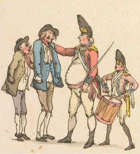 The well-fed officer above assesses new recruits, who are obviously not officer material. One imagines that their lives in the army will not be as cushy as Captain Denny’s or Mr. Wickham’s, and that they would perform the most plebeian tasks.