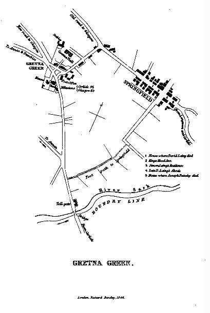 They sped on their journey at a fair pace and…Arrived at Springfield by the old road–for neither the present new one nor Gretna Hall were in existence–they repaired to the King’s Head hostel, and in that hostel, to the parlour or sitting-room on the right hand of the door at entering. Here they…”married in haste:” and let us add also… they shortly afterwards” repented at leisure,” but with that we have nothing to do.
