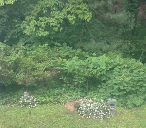 Cody’s grave (right) covered with mock orange blossom. Barney’s grave (my other dog) is to the left.