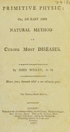John Wesley, the Methodist preacher, wrote a very popular book called Primitive Physic: Or, An Easy and Natural Method of Curing Most Diseases. It went through many editions and is still available today (I bought mine at the Wesley Museum in London). His goal was to list “cheap, safe, and easy medicines” available to “plain, unlettered” people. He marked those he had tried himself. Wesley started with lifestyle recommendations, such as, eat and drink moderately, and exercise regularly. Then he gave remedies for many diseases.
