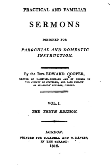 This was Edward Cooper’s Practical and Familiar Sermons Designed for Parochial and Domestic Instruction (meaning for reading at home and for preaching to churches), first published in 1809. The earlier volumes were one in 1803 criticizing the practice of the militia drilling on Sundays (a day of rest), and then Sermons, Chiefly Designed to Elucidate Some of the Leading Doctrines of the Gospel (1804).