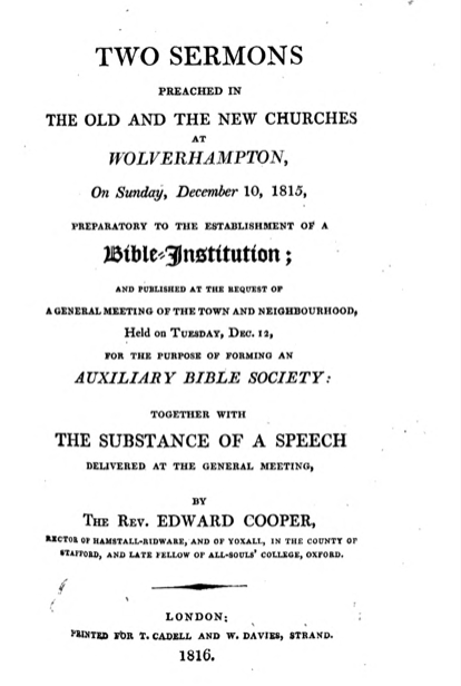Edward Cooper, Wolverhampton Sermons, Jan. 1, 1816. You can also find seven volumes of his Practical and Familiar Sermons, in various editions, online.