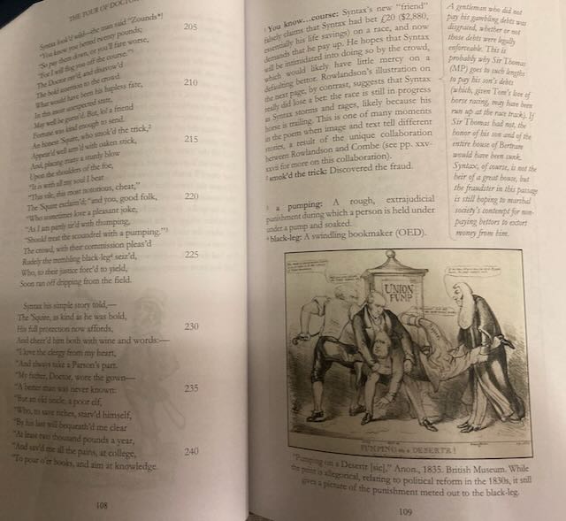 The best part, for me, are comments pointing out parallels with Jane Austen’s work. I can’t even begin to list these, but there are many great insights. Some are about the clergy in Austen’s work, since Syntax is an underpaid country curate like Charles Hayter of Persuasion. Many comments have to do with the “picturesque,” “improvement” and country estates ranging from Sotherton to Pemberley. Others relate to the class system, Gothic novels, and other topics.