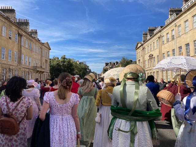 After a few pre-Festival events, the 2024 Jane Austen Festival officially kicked off with a Grand Regency Costumed Promenade on Saturday morning. Organizers were expecting 1100 people in full Regency dress. We walked through Bath, from the Holbourne Museum at Sydney Gardens (near one of the Austen’s homes in Bath) all the way up to the Assembly Rooms (the “Upper Rooms” in Austen’s time).