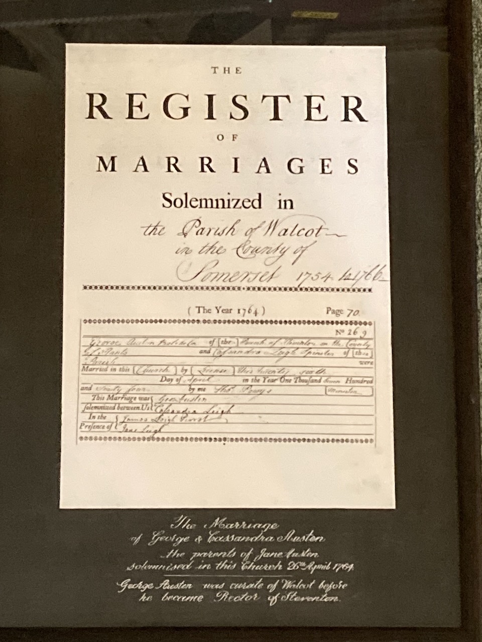 Jane’s father, George Austen, studied at Oxford University. He eventually became an assistant chaplain, then a proctor (in charge of student discipline), called “the Handsome Proctor.” At some point he met Cassandra Leigh, niece of the Master of Balliol College at Oxford. Cassandra was the daughter of a clergyman. Her father eventually retired and moved with his family to Bath. After he died, Cassandra Leigh agreed to marry George Austen, and they were married on April 2, 1764, at St. Swithin’s Church. The register states that Cassandra was living in Walcot parish, while George was in the parish of Steventon in Hampshire. Cassandra’s mother came to the wedding, and her brother, James Leigh-Perrot, and her sister, Jane Leigh, signed as witnesses. George was 32 and Cassandra was 24. They were married by license, presumably a common license, not by banns.