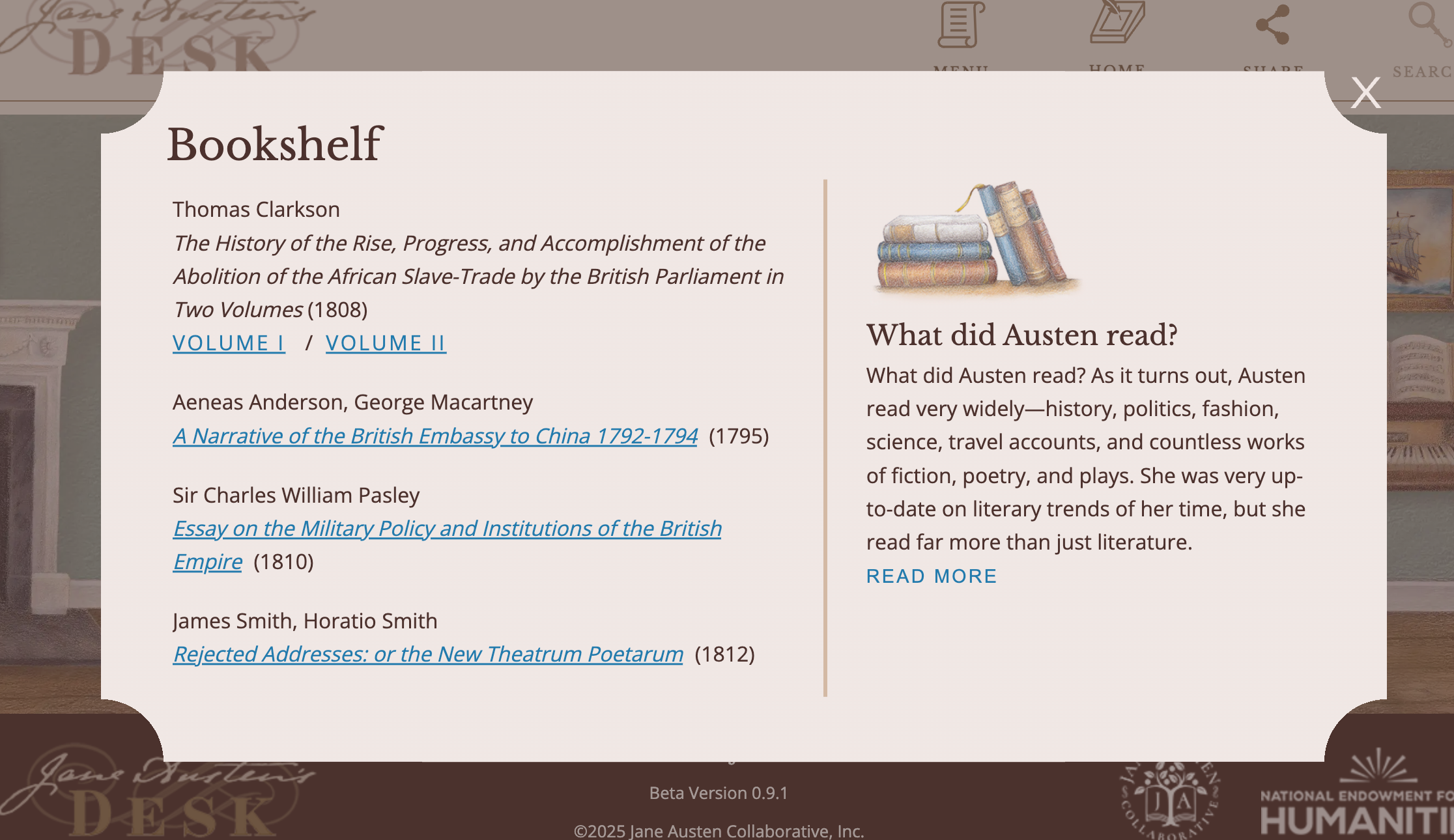 Click on the bookshelves in Rev. Austen’s bureau-bookcase , and you’ll see some books mentioned in Austen’s writings. I expect this will be expanded later. But for now, you can read from several authors Austen said she was “in love with”—Thomas Clarkson (on abolition), Sir Charles Pasley (on the military), and James and Horatio Smith (verse parodies). We also have a book that Fanny Price was reading, George Macartney on the British Embassy to China.