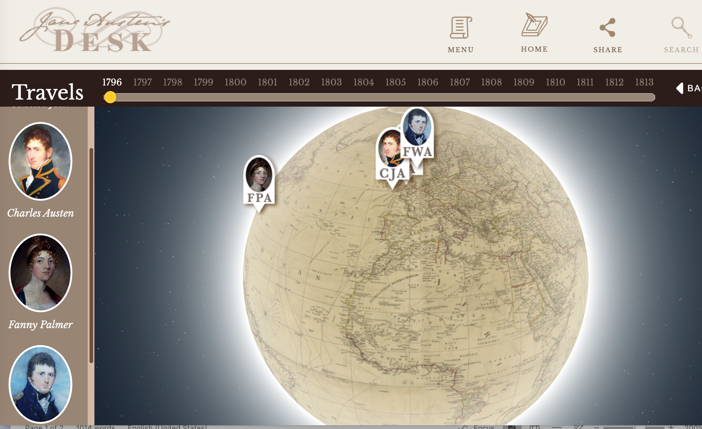 Above the pianoforte, click on the portrait of a ship on the sea. You go to a globe, where you can follow the travels of Austen’s family.