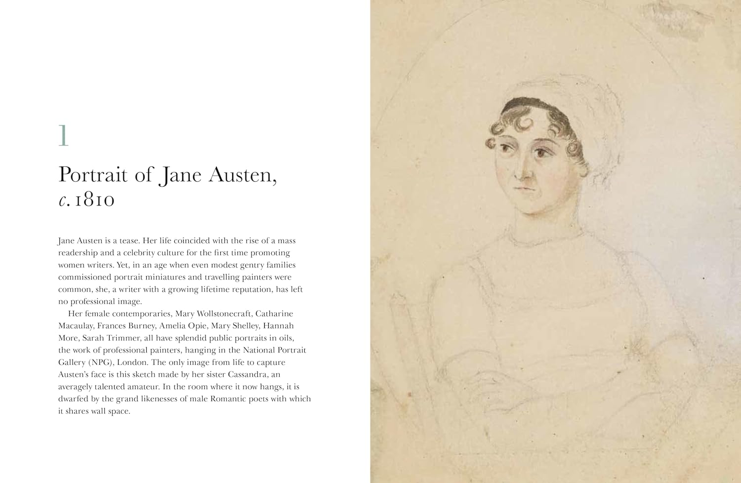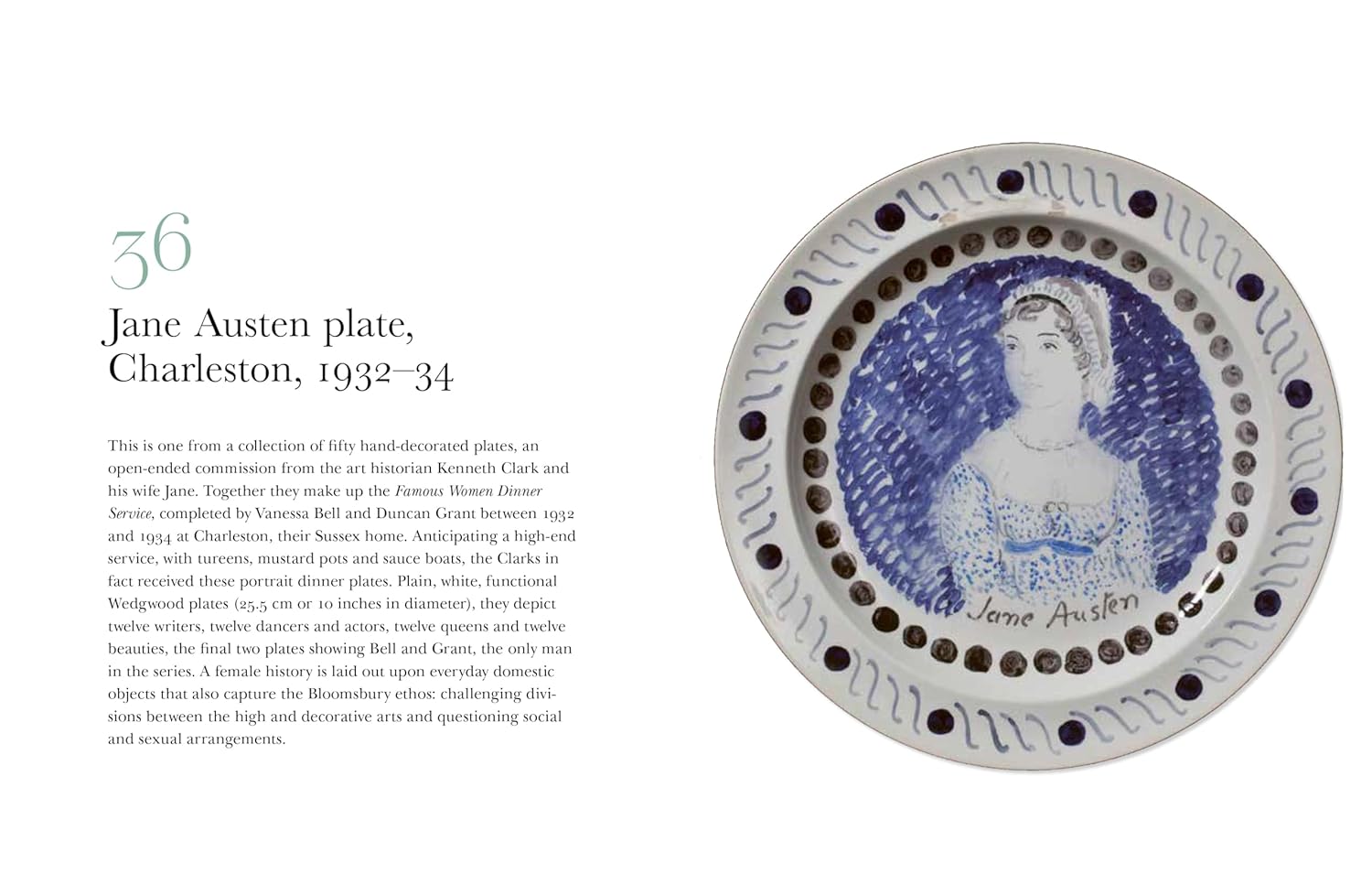 Among objects described in this book are a teenage notebook, a muslin shawl, a wallpaper fragment, a tea caddy, the theatrical poster for a play she attended, and the dining-room grate at Chawton Cottage where she lived. Poignantly, the last manuscript page of her unfinished novel and a lock of hair, kept by her devoted sister, Cassandra, are also featured. Objects contributing to Austen’s rich cultural legacy include a dinner plate decorated by Bloomsbury artists Vanessa Bell and Duncan Grant, Grayson Perry’s commemorative pot from 2009, and even Mr Darcy’s wet shirt, worn by Colin Firth in the 1995 BBC adaptation.
