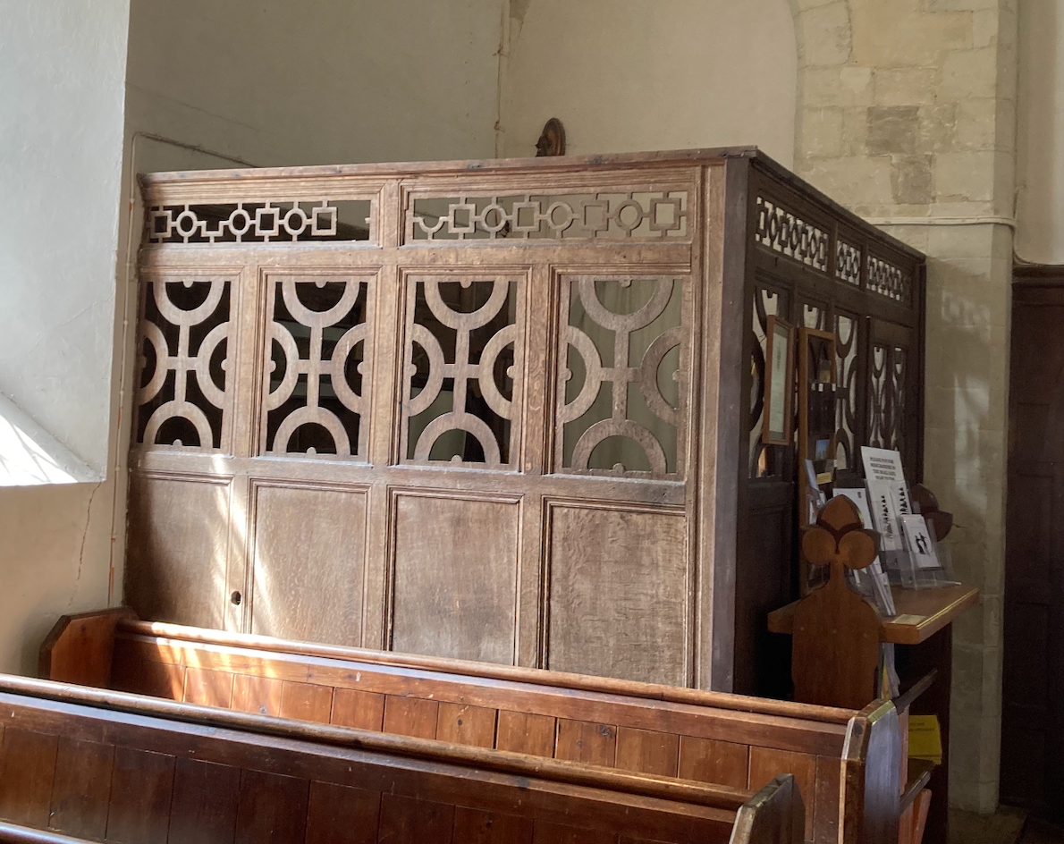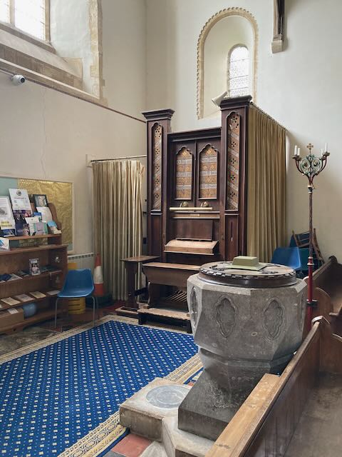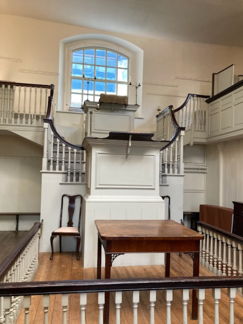 In her time, the chuch had a triple-decker pulpit: a high wooden pulpit with a sounding board over it (a wooden structure reflecting the sound forward), from which the vicar would preach. Below that was the vicar’s “prayer desk,” from which he would lead the service, reading prayers and Scriptures. And below that, the “parish clerk’s pew,” from which the church clerk would lead congregational responses. (These are the three “decks” of the pulpit.) (See another example here.)