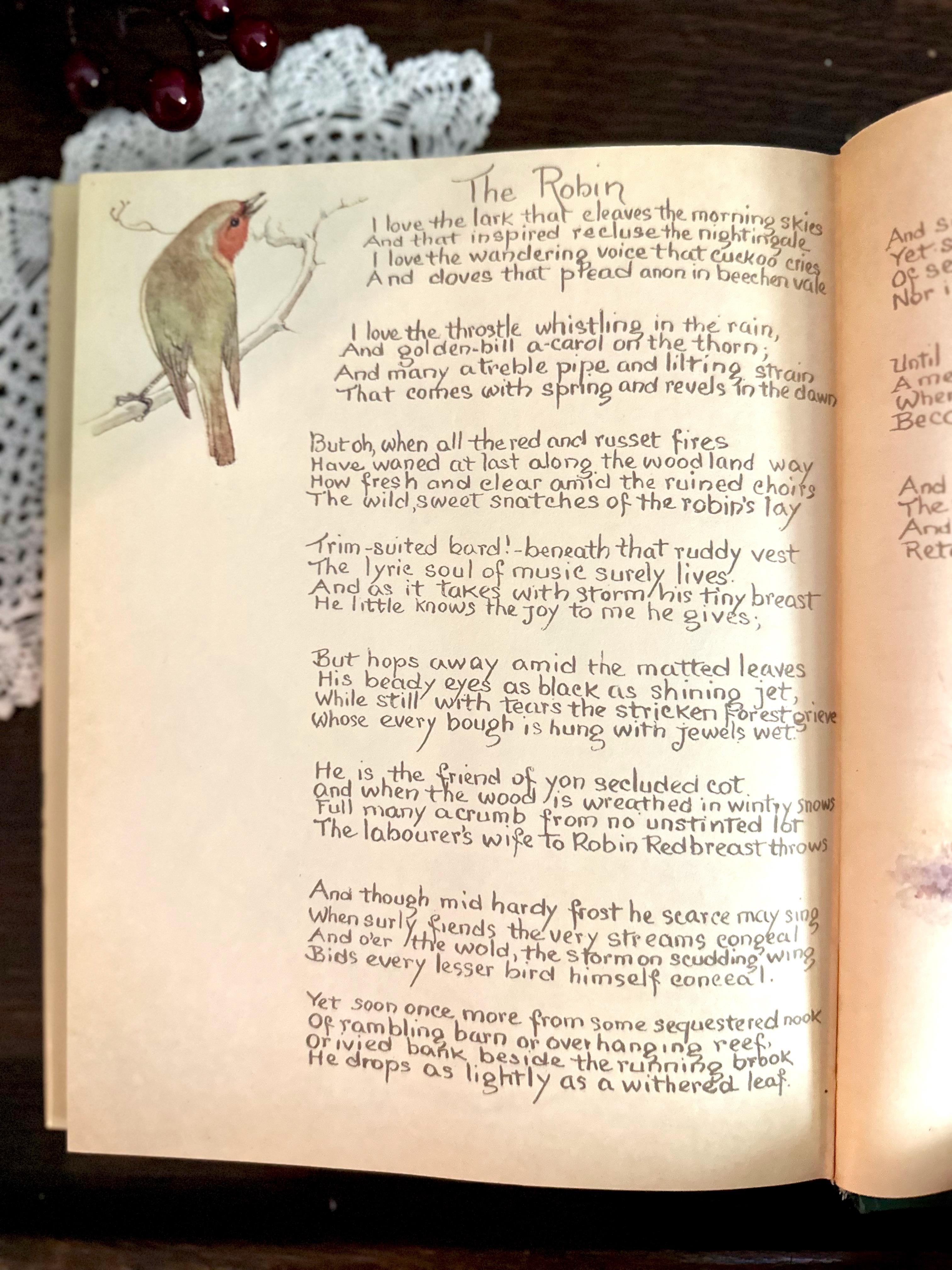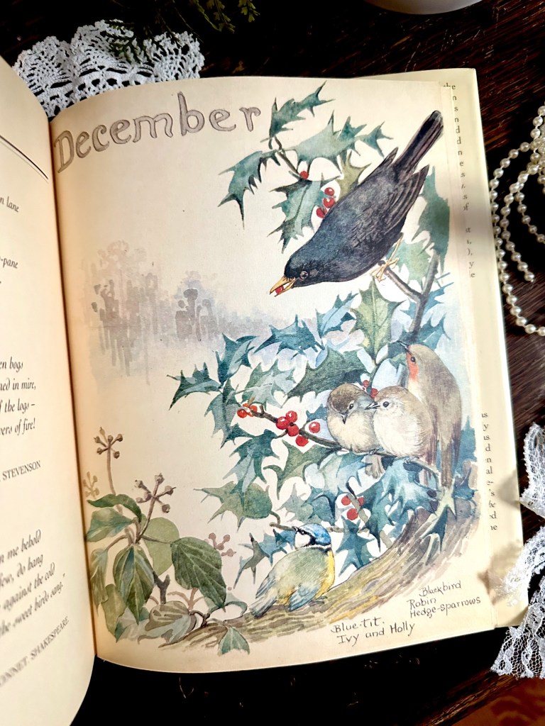 In The Nature Notes of an Edwardian Lady (1905) by Edith Holden, a journal of watercolor paintings of flowers, plants, birds and butterflies, along with poems and anecdotes, the author has a section devoted to each month of the year. For December, she includes this watercolor of several birds, including a robin. She also includes a poem about robins.
