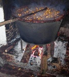 The recipe for making black butter, or apple butter as it is commonly known today, harkens back to medieval times. After the winter crop was picked, the preserve was made in huge quantities. In the 18th century, twenty percent of Jersey’s arable land was made up of orchards, and the tradition of producing ‘black butter’ or ‘Le Niere Buerre’ became an annual social and festive occasion. Jersey black butter was made from cider apples that were slowly boiled over a fire. Women would peel hundreds of pounds of apples, while the men and children would gather enough wood to keep the fire going for almost two days. After the cider was ‘reduced’ by half, apples, sugar, lemon, liquorice and spices were added. The Jersey tradition of making black butter included singing, dancing, and storytelling all through the night and until early morning. Jersey Island black butter is characterized by the addition of liquorice, which made the preserve quite dark. – RecipeZaar & BBC Jersey Black Butter.
