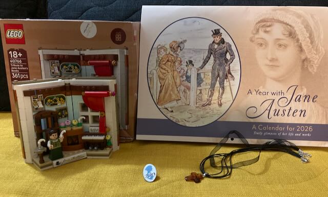 All these events included great shopping arcades. Here are just a few of my favorite acquisitions: an amber cross on a ribbon (like Fanny Price’s) from JASP; a Jane Austen Lego set (40766) from the Festival Fayre in Bath; and an Austen calendar (with dates identified by things that happened in Austen’s life or novels) from the AGM (Wisconsin region does these every year). The 250 pin is also from the AGM.