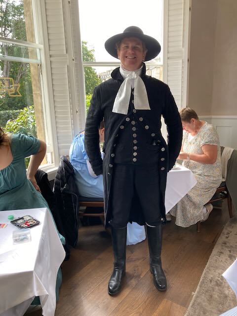 A gentleman dressed as Mr. Collins, at “Sew Chatty,” where people brought their sewing projects and socialized, as Austen and her characters socialize over their “work,” their sewing.