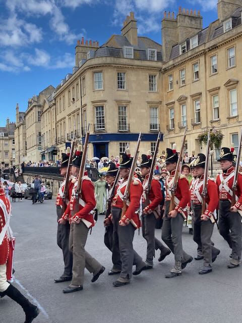 Soldiers lead 2,000 people in Regency dress who promenaded through Bath for the 2025 Jane Austen Festival.