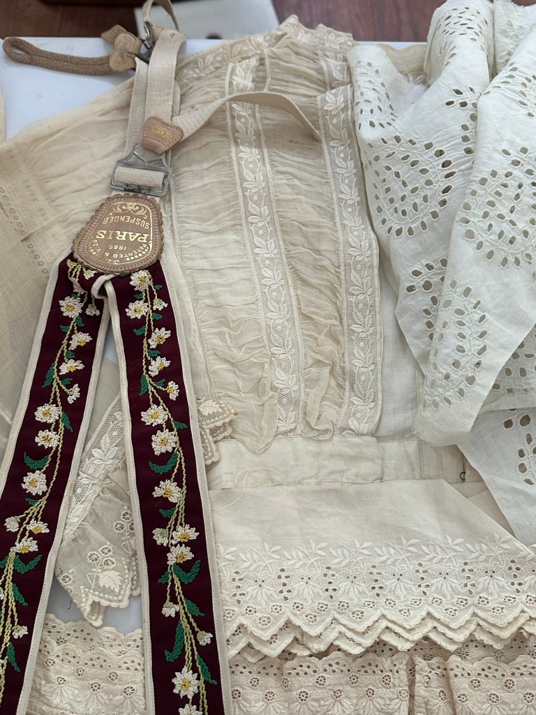 Many attendees wore beautiful period clothing. A tent village offered many types of shops. Dresses, hats, fabric and sundries were for sale.