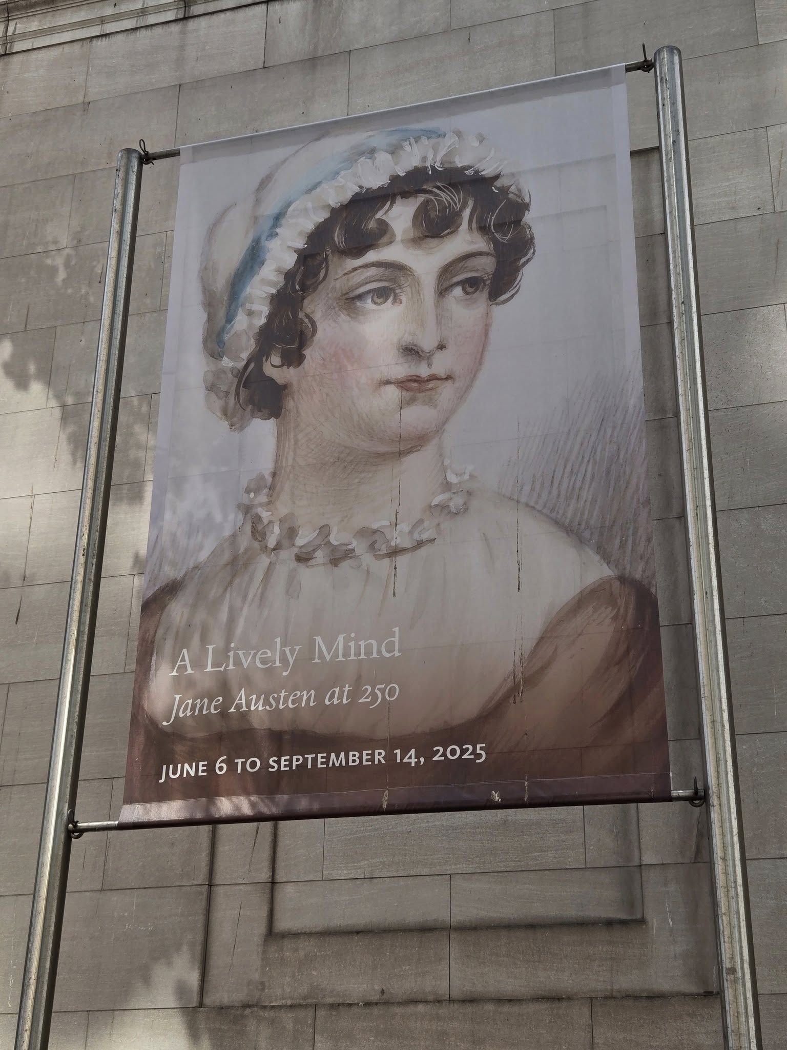 Many Janeites traveled up to New York City to see the fantastic exhibition hosted by the Morgan Library for Jane’s 250th birthday. A group from our Georgia region visited together on the opening weekend. Renata Dennis said the exhibit was jam-packed with fascinating materials. She enjoyed seeing everyday objects like letters, maps, a ledge of expenditures, and a reproduction of Jane’s pelisse. The exhibit addressed different aspects of Jane’s life, her family, life in England at that time, and her relationships. It also included her books in different languages and adaptations.