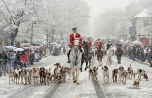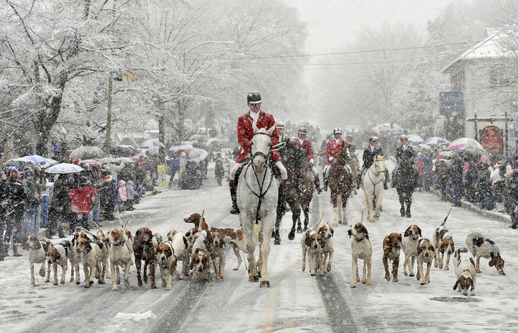 Foxhunts were imported into America in the 17th century. In 1799, a wry New England minister gave a glimpse of the sport in the New World: “From about the first of Octor. this amusement begins, and continues till March or April. A party of 10, and to 20, or 30, with double the number of hounds, begins early in the morning, they are all well mounted. They pass thro’ groves, Leap fences, cross fields, and steadily pursue, in full chase wherever the hounds lead. At length the fox either buroughs out of their way, or they take him. If they happen to be near, when the hounds seize him, they take him alive, and put him into a bag and keep him for a chase the next day. They then retire in triumph, having obtained a conquest to a place where an Elegant supper is prepared. After feasting themselves, and feeding their prisoner, they retire to their own houses. The next morning they all meet at a place appointed, to give their prisoner another chance for his life. They confine their hounds, and let him out of the bag—away goes Reynard at liberty—after he has escaped half a mile—hounds and all are again in full pursuit, nor will they slack their course thro’ the day, unless he is taken. This exercise they pursue day after day, for months together. This diversion is attended by old men, as well as young—but chiefly by married people. I have seen old men, whose heads were white with age, as eager in the chase as a boy of 16. It is perfectly bewitching. The hounds indeed make delightful musick—when they happen to pass near fields, where horses are in pasture, upon hearing the hounds, they immediately begin to caper, Leap the fence and pursue the Chase—frequent instances have occurred, where in leaping the fence, or passing over gullies, or in the woods, the rider has been thrown from his horse, and his brains dashed out, or otherwise killed suddenly. This however never stops the chase—one or two are left to take care of the dead body, and the others pursue.” – Colonial Williamsburg, Personable Pooches